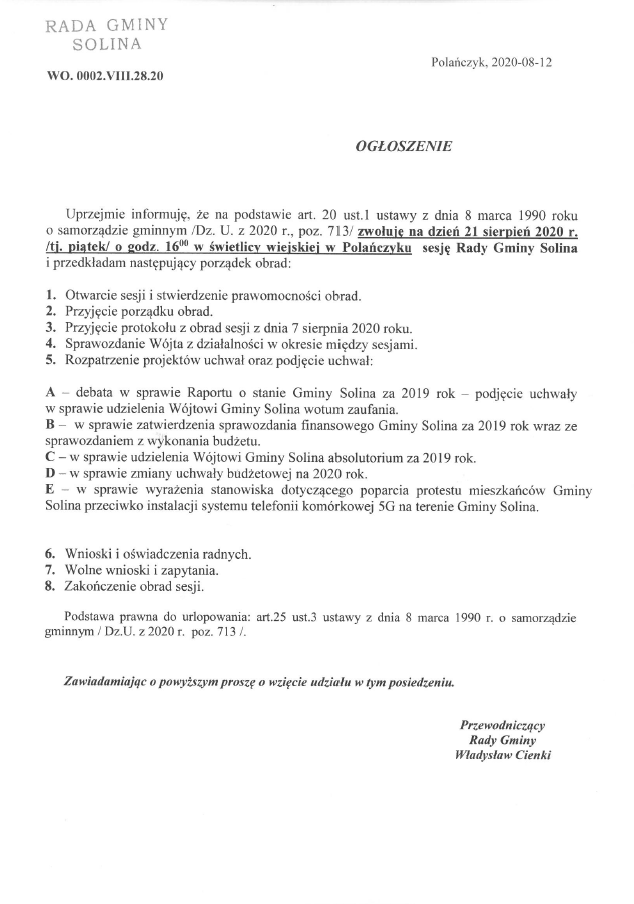 Ogłoszenie o zwołaniu na dzień 21 sierpnia 2020 roku Sesji Rady Gminy Solina