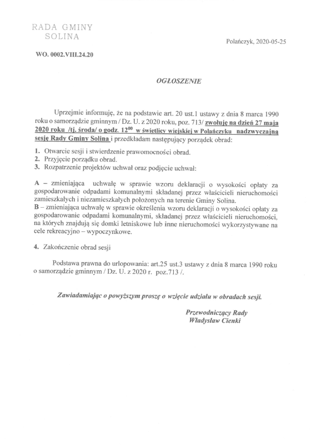 Ogłoszenie o zwołaniu na dzień 27 maja 2020 roku Nadzwyczajnej Sesji Rady Gminy Solina