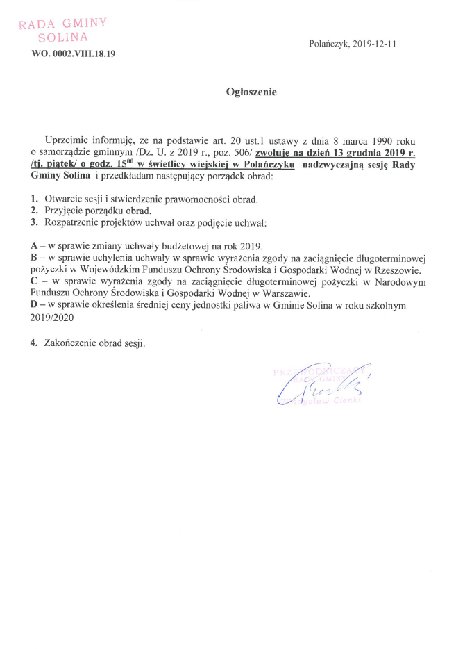 Ogłoszenie o zwołaniu na dzień 13 grudnia 2019 roku Nadzwyczajnej Sesji Rady Gminy Solina