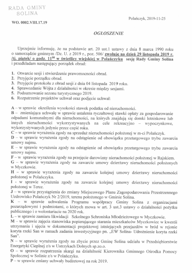 Ogłoszenie o zwołaniu na dzień 29 listopada 2019 roku Sesji Rady Gminy Solina
