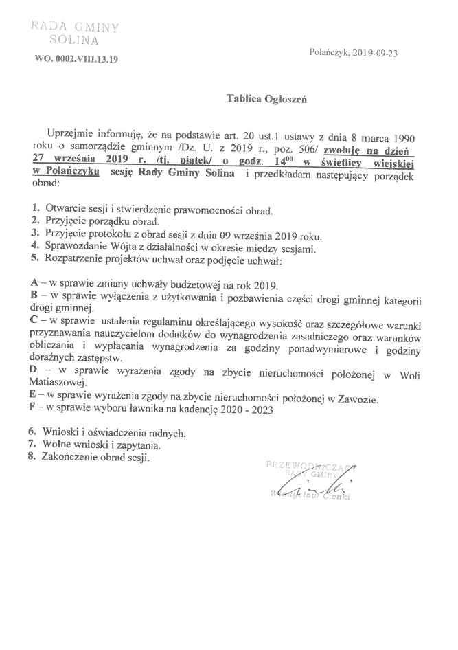 Ogłoszenie o zwołaniu na dzień 27 września 2019 roku Sesji Rady Gminy Solina