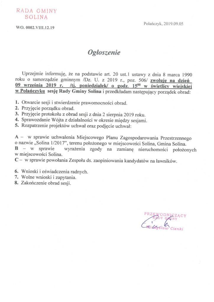 Ogłoszenie o zwołaniu na dzień 09 września 2019 roku Sesji Rady Gminy Solina