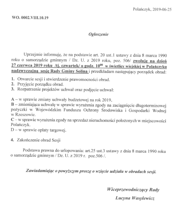 Ogłoszenie o zwołaniu na dzień 27 czerwca 2019 roku Sesji Rady Gminy Solina