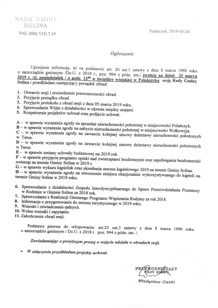 Ogłoszenie o zwołaniu na dzień 25 marca 2019 roku Sesji Rady Gminy Solina