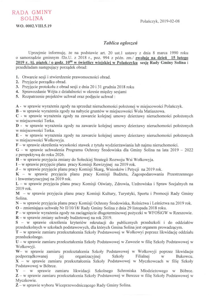 Ogłoszenie o zwołaniu na dzień 15 lutego 2019 roku Sesji Rady Gminy Solina
