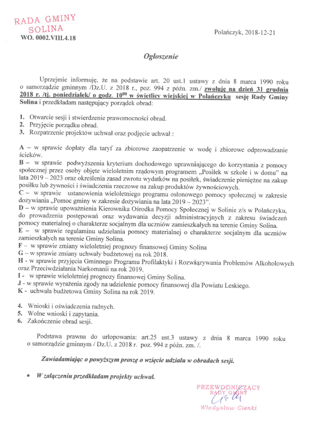 Ogłoszenie o zwołaniu na dzień 31 grudnia 2018 roku Sesji Rady Gminy Solina