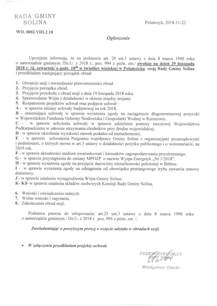 Ogłoszenie o zwołaniu na dzień 29 listopada 2018 roku pierwszej Sesji Rady Gminy Solina