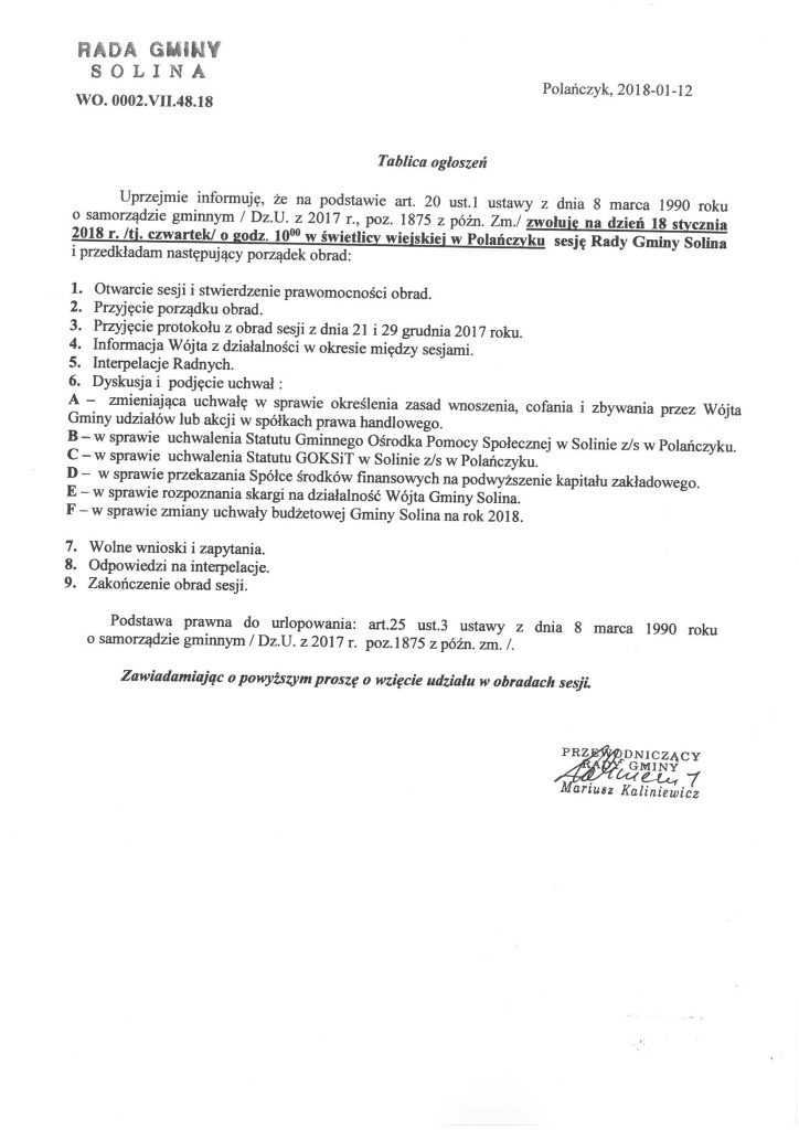Ogłoszenie o zwołaniu na dzień 18 stycznia 2018 r. sesji Rady Gminy Solina