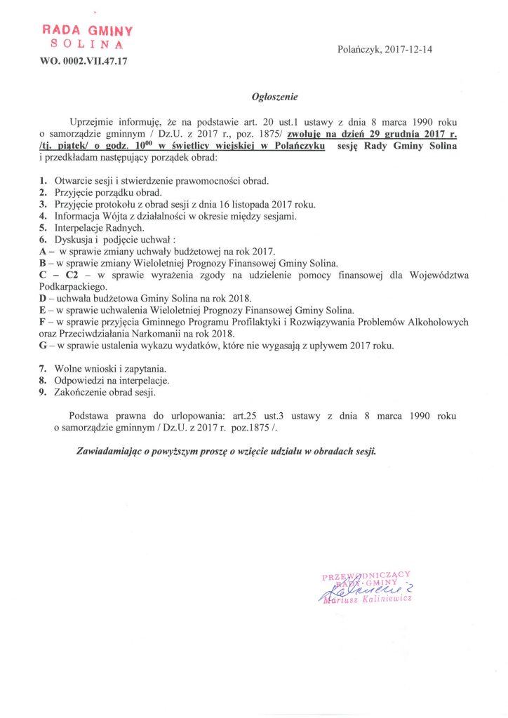 Ogłoszenie o zwołaniu na dzień 29 grudnia 2017 r. sesji Rady Gminy Solina
