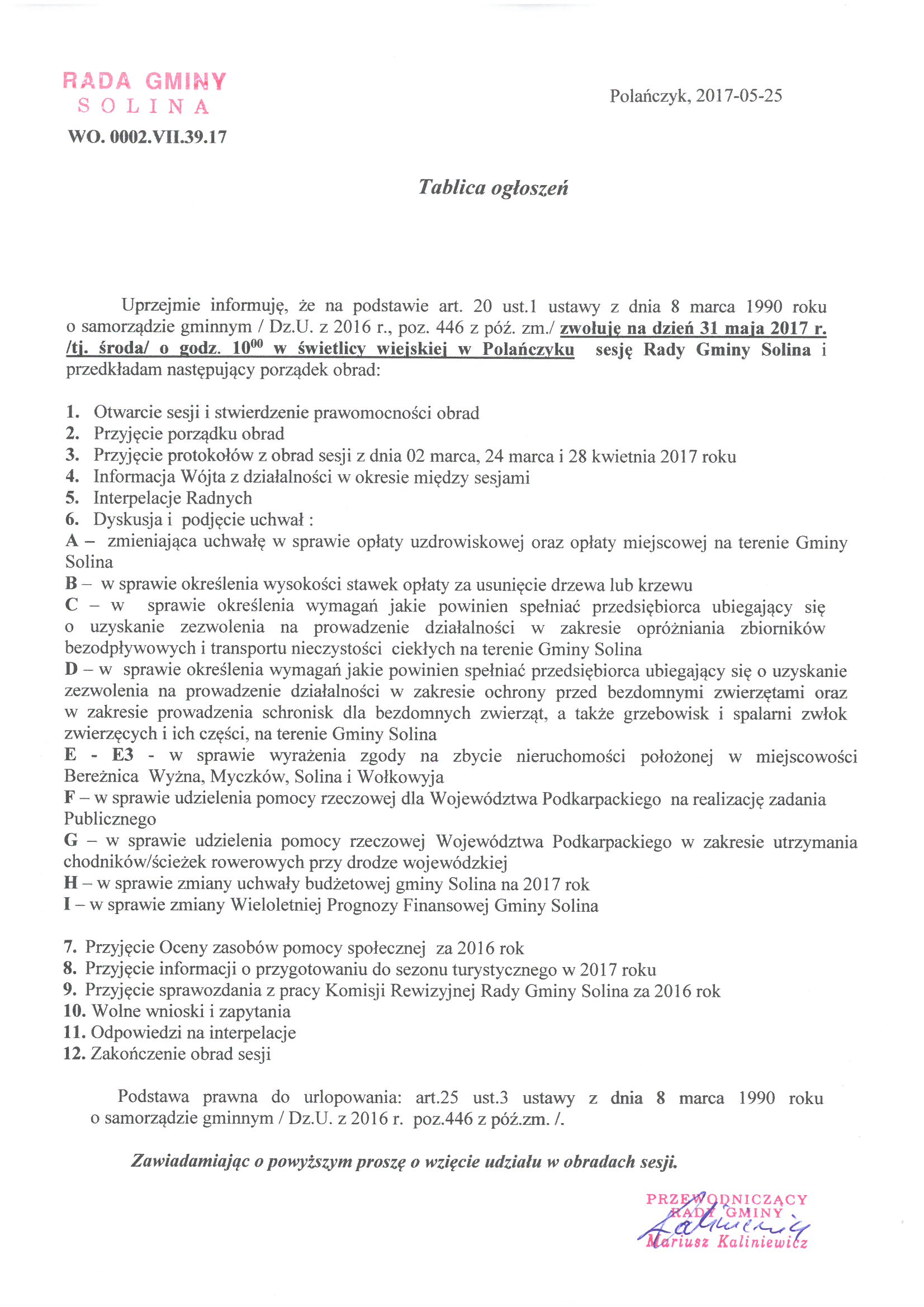 Ogłoszenie o zwołaniu na dzień 31.05.2017 r. sesji Rady Gminy Solina