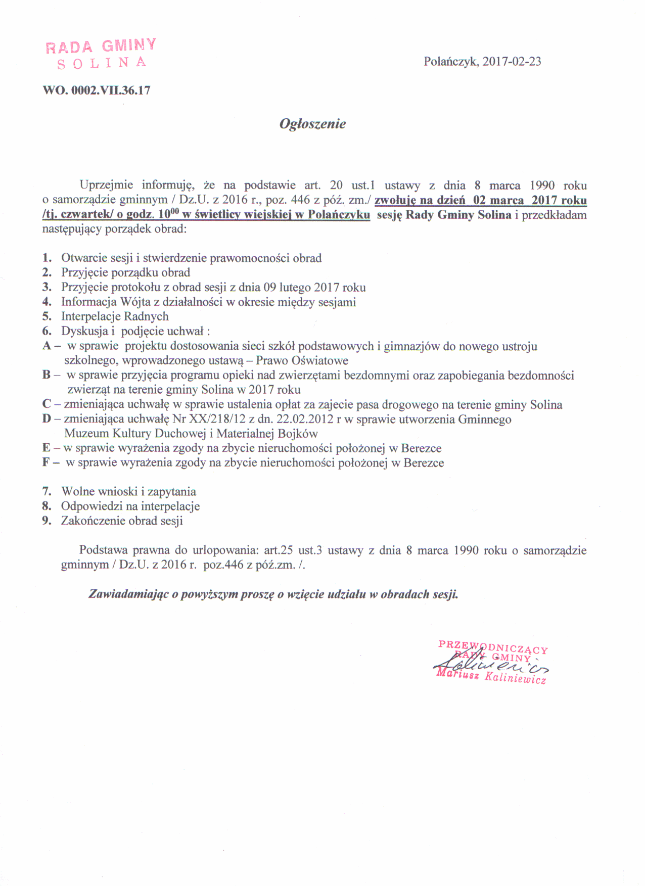 Ogłoszenie o zwołaniu na dzień 02.03.2017 sesji Rady Gminy Solina