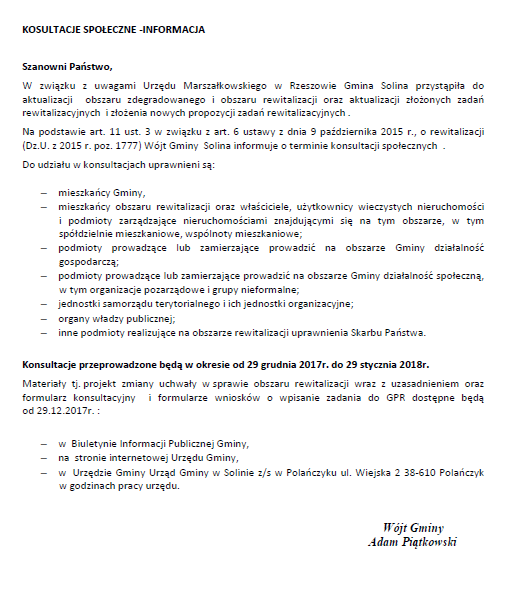do udziału w konsultacjach społecznych organizowanych w dniach 29.12.2017 r. – 29.01.2017 r.