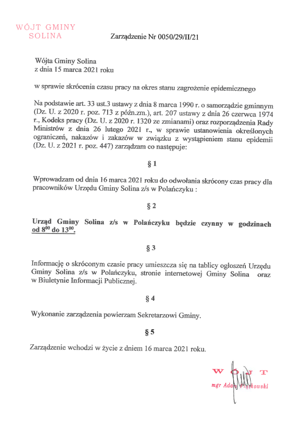 nr 0050/29/II/21 z dnia 15 marca w sprawie skrócenia czasu pracy na czas stanu zagrożenia epidemicznego.