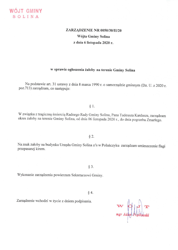 w sprawie ogłoszenia żałoby na terenie Gminy Solina