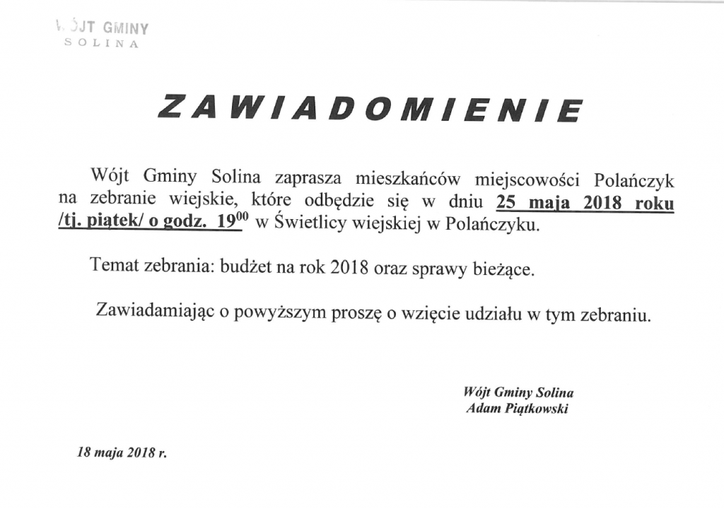 o terminie zebrania Sołectwa Polańczyk