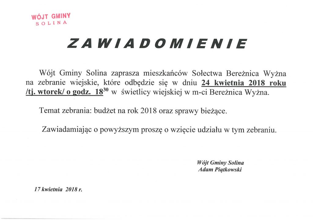 o terminie zebrania Sołectwa Bereżnica Wyżna