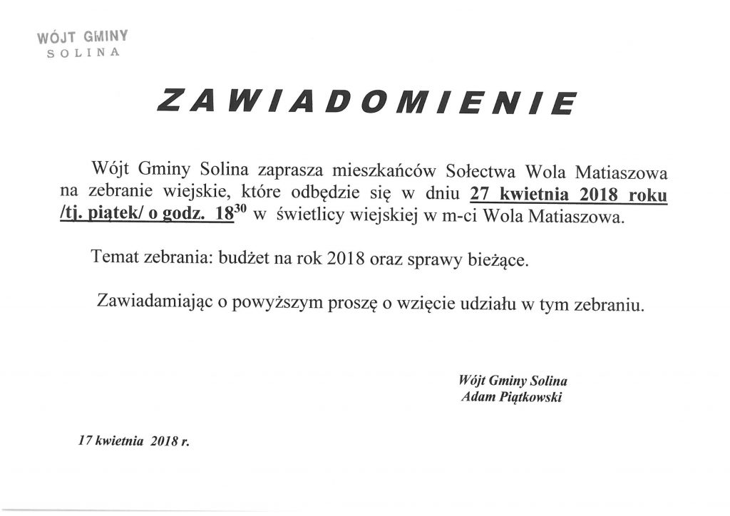 o terminie zebrania Sołectwa Wola Matiaszowa