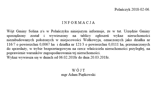 Obwieszczenie Wójta Gminy Solina z dnia 24 stycznia 2025 r.