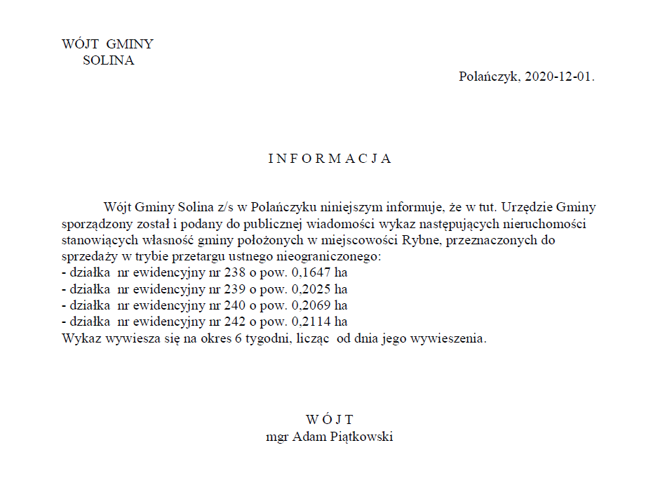 Obwieszczenie Wójta Gminy Solina z dnia 24 stycznia 2025 r.