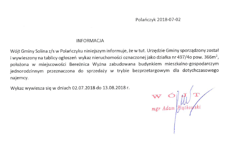 Obwieszczenie Wójta Gminy Solina z dnia 24 stycznia 2025 r.