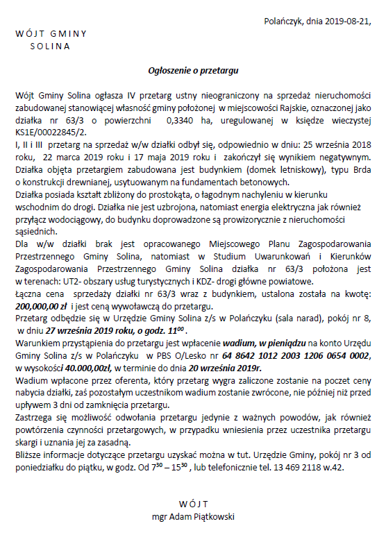 Wójt Gminy Solina ogłasza IV przetarg ustny nieograniczony na sprzedaż nieruchomości zabudowanej stanowiącej własność gminy położonej w miejscowości Rajskie