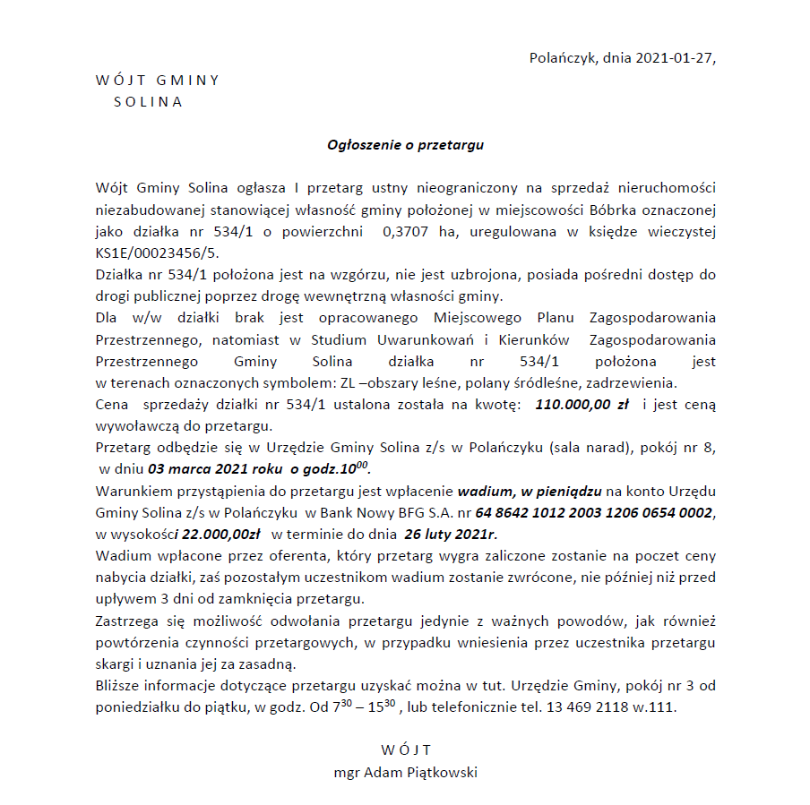 Obwieszczenie Wójta Gminy Solina z dnia 24 stycznia 2025 r.