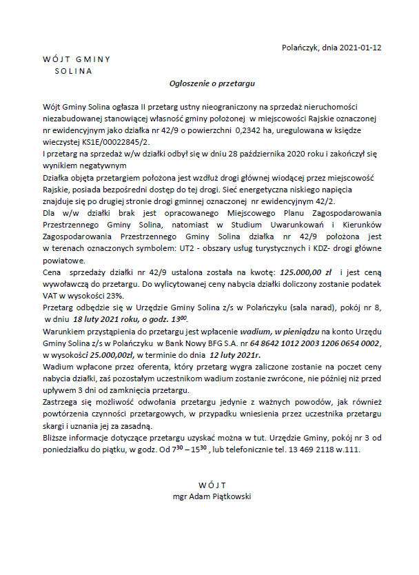 Obwieszczenie Wójta Gminy Solina z dnia 24 stycznia 2025 r.