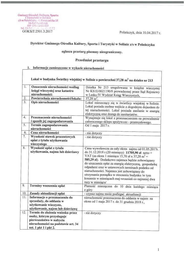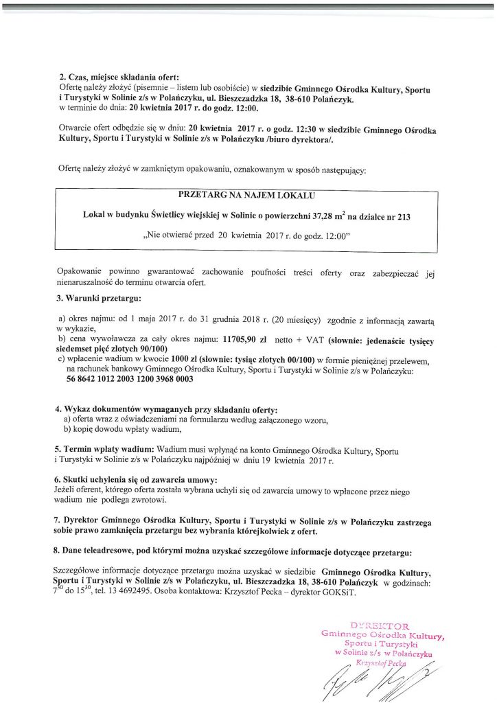 2. Zarządzenie Wójta Gminy Solina + Regulamin przeprowadzania przetargów na oddanie w dzierżawę/najem na okres powyżej 3 miesięcy do 3 lat nieruchomości stanowiących własność Gminy Solina