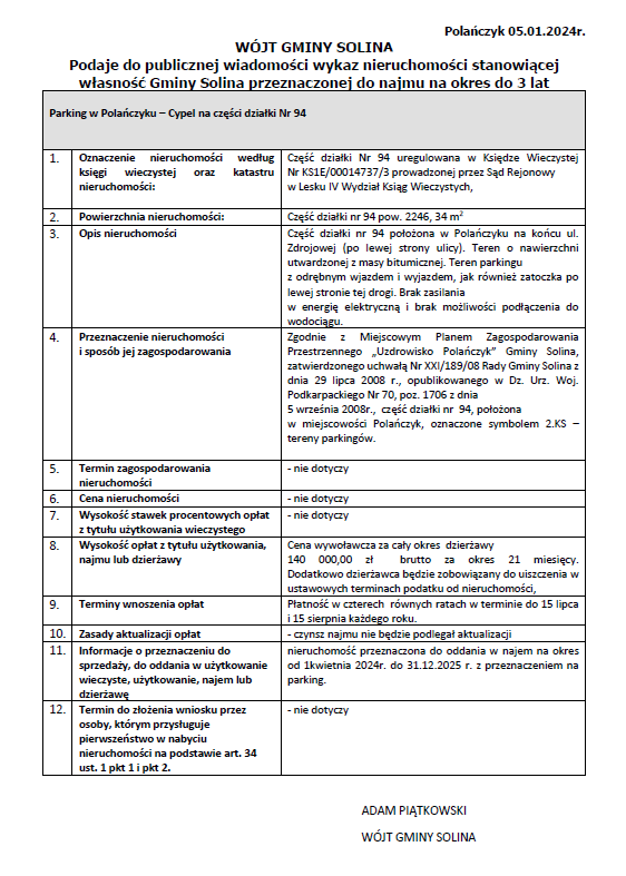 Obwieszczenie Wójta Gminy Solina z dnia 24 stycznia 2025 r.