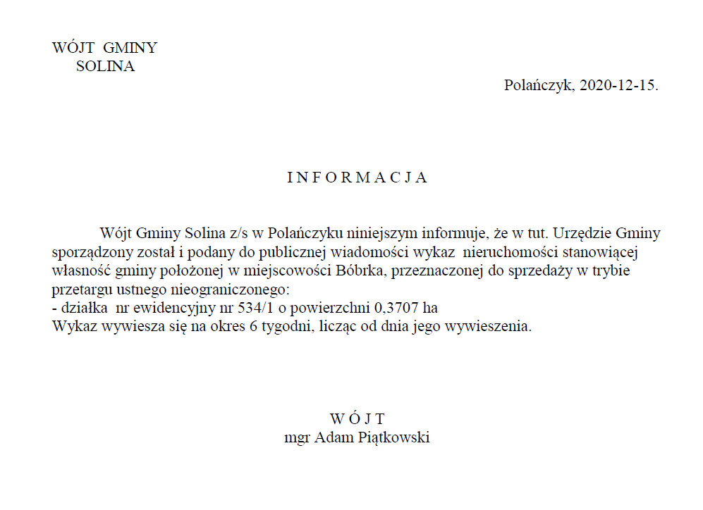 Obwieszczenie Wójta Gminy Solina z dnia 24 stycznia 2025 r.