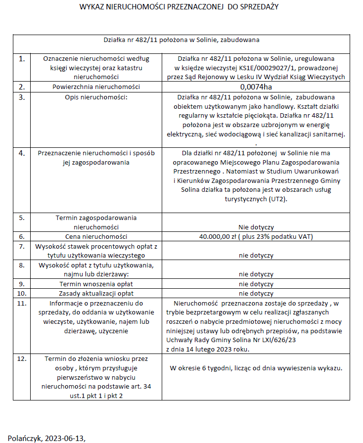 Wykaz nieruchomości przeznaczonej do sprzedaży
