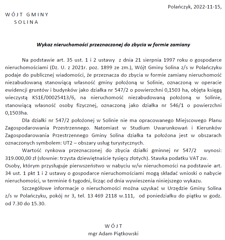 Obwieszczenie Wójta Gminy Solina z dnia 24 stycznia 2025 r.