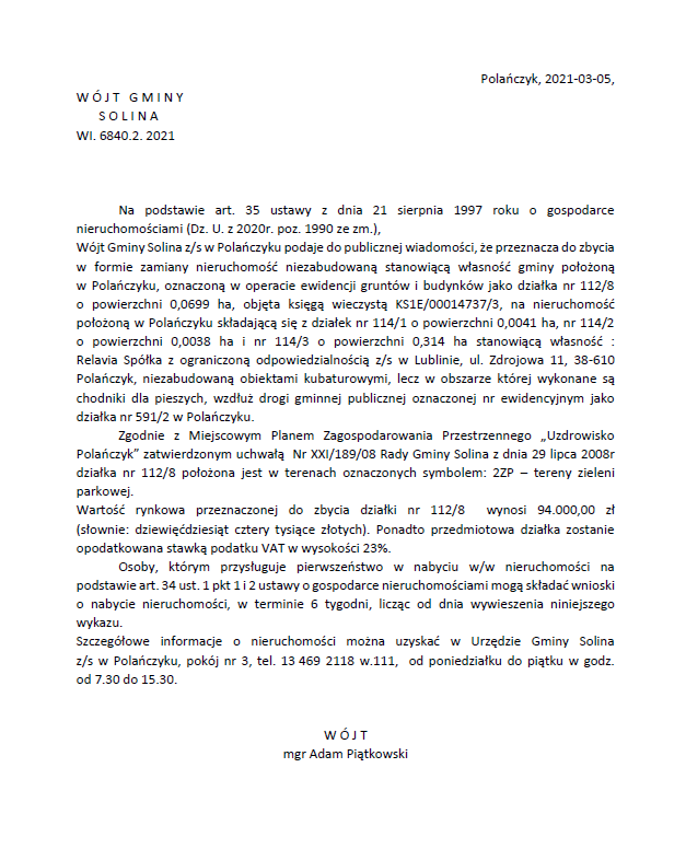Obwieszczenie Wójta Gminy Solina z dnia 24 stycznia 2025 r.