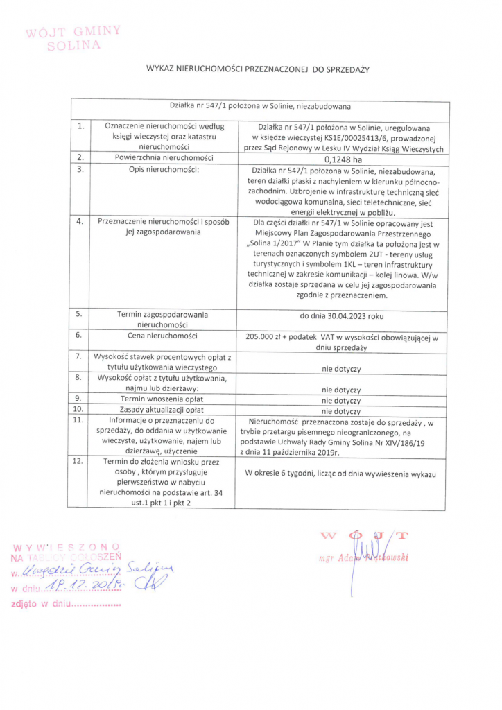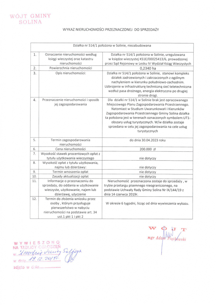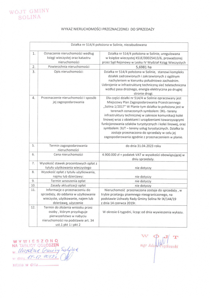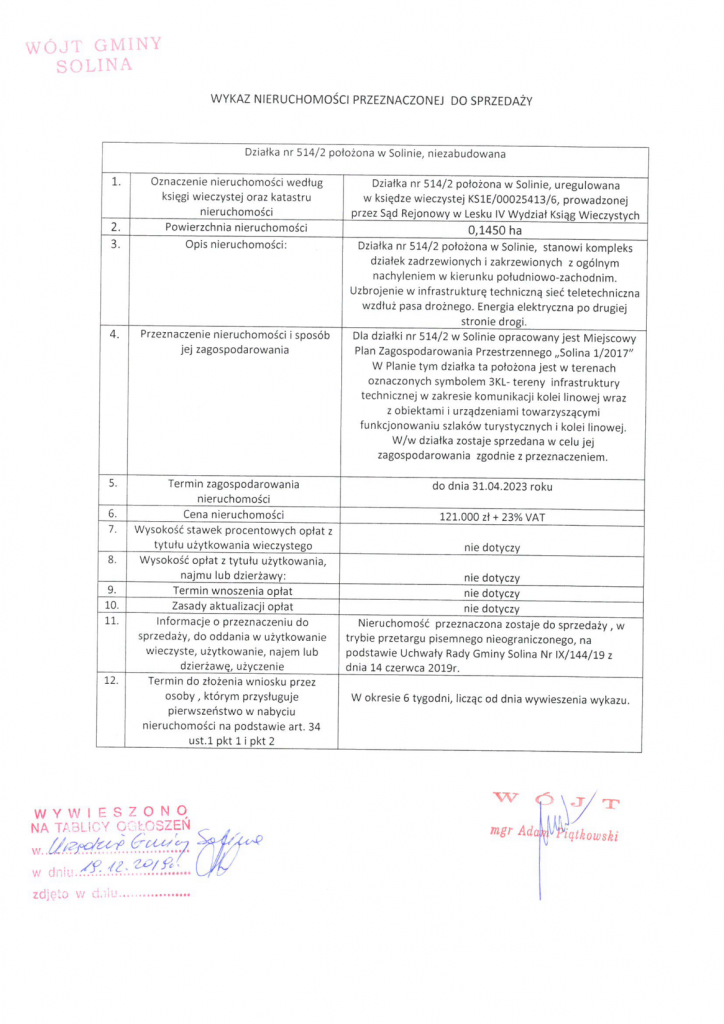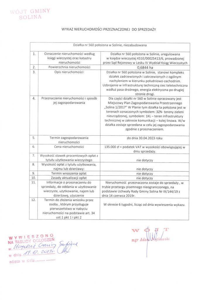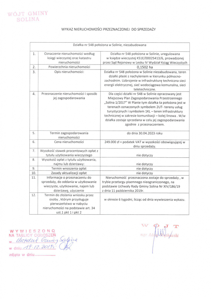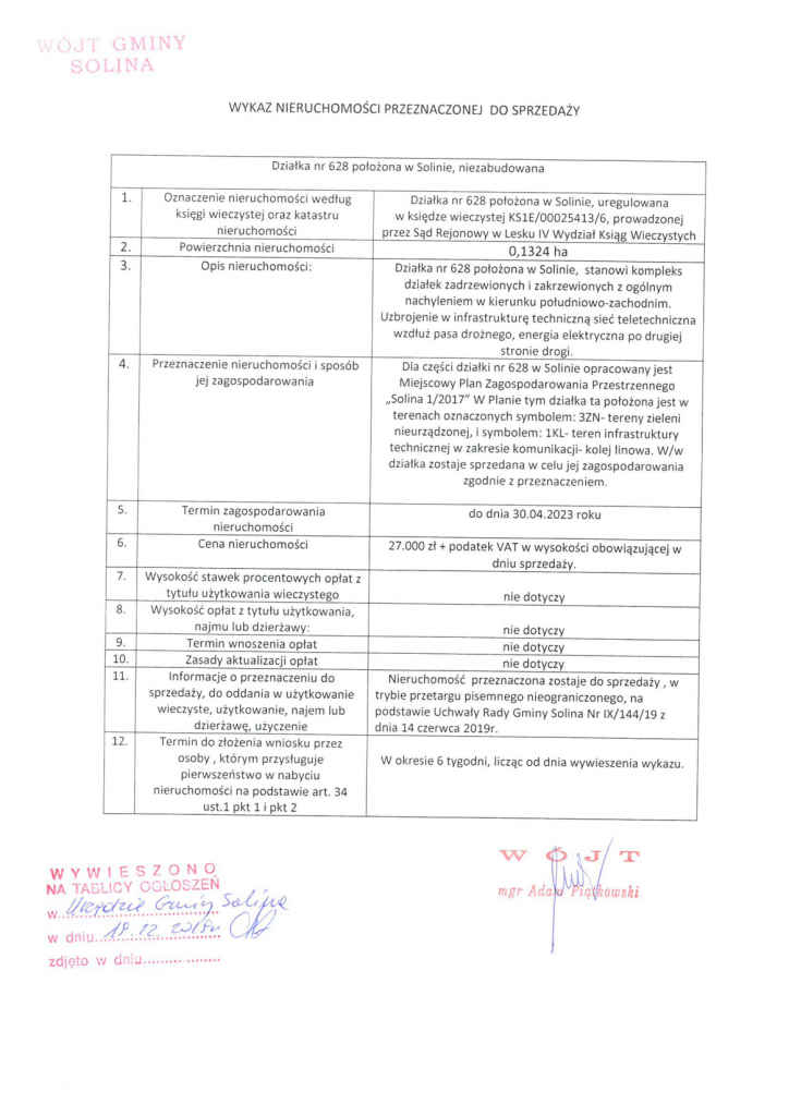 Gmina Solina Ogłoszenia Wykaz nieruchomości przeznaczonych do sprzedaży