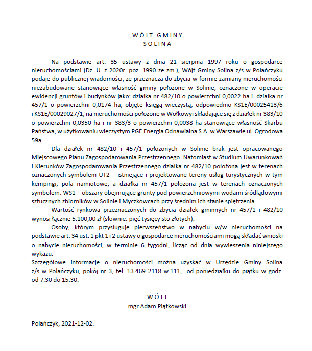 Obwieszczenie Wójta Gminy Solina z dnia 24 stycznia 2025 r.