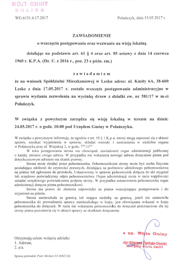 Zawiadomienie o wszczęciu postępowania oraz wezwanie na wizję lokalną