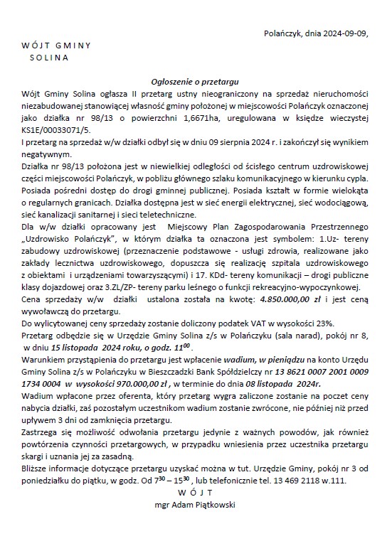 Obwieszczenie Wójta Gminy Solina z dnia 24 stycznia 2025 r.