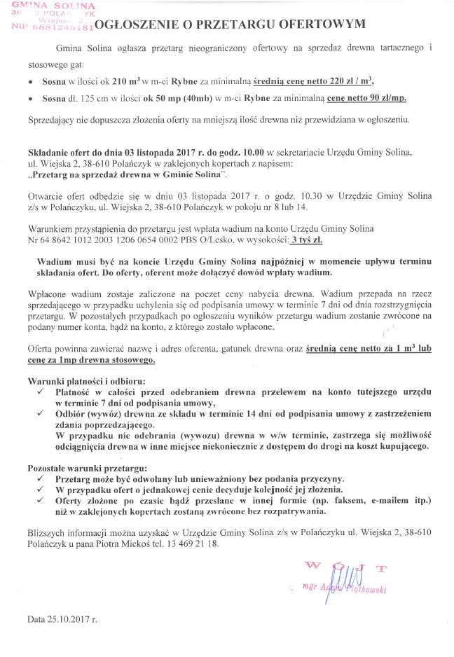 Gmina Solina ogłasza przetarg nieograniczony ofertowy na sprzedaż drewna tartacznego i stosowego